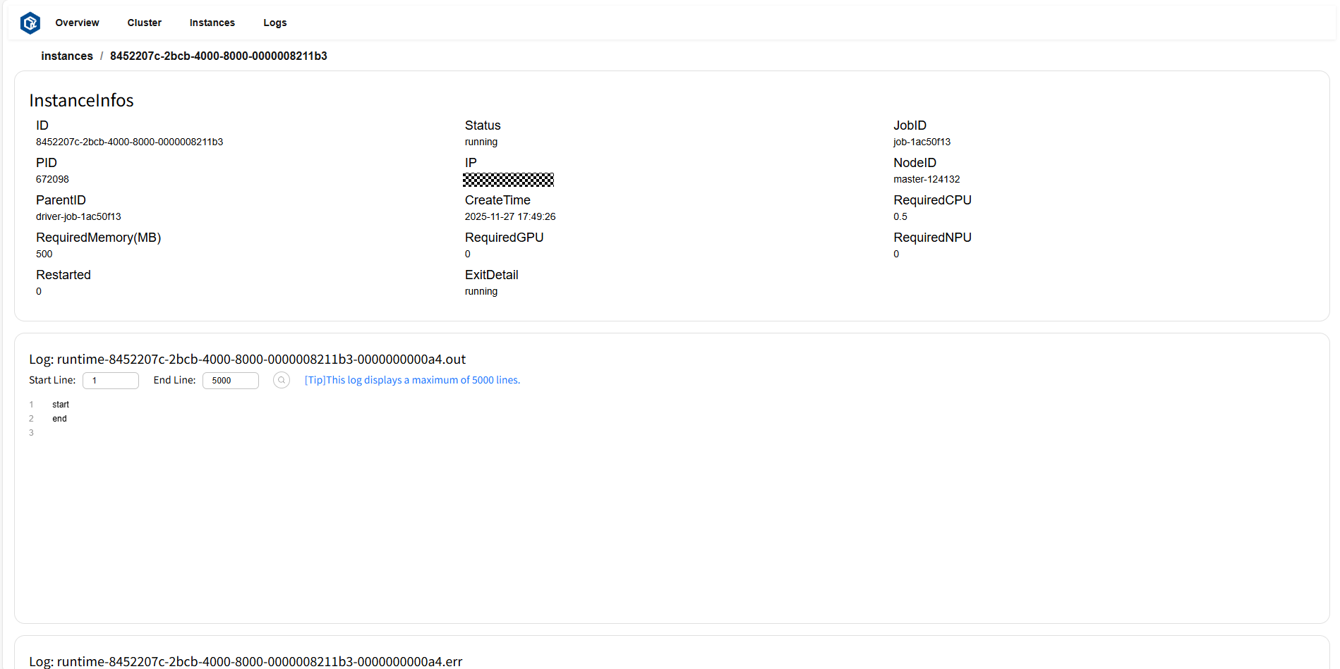 点击 ID 或 log 跳转至实例详情页。其中实例详情卡片(InstanceInfos)展示了此实例的详细信息,日志卡片(Log)显示此实例的日志和错误信息。