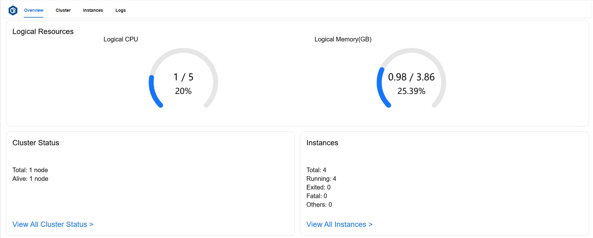 Overview 页面可以查看总逻辑资源占用率、概览所有组件和实例状态。