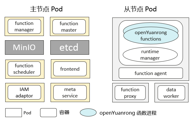 openYuanrong 集群由主节点 pod 和从节点 pod 组成。