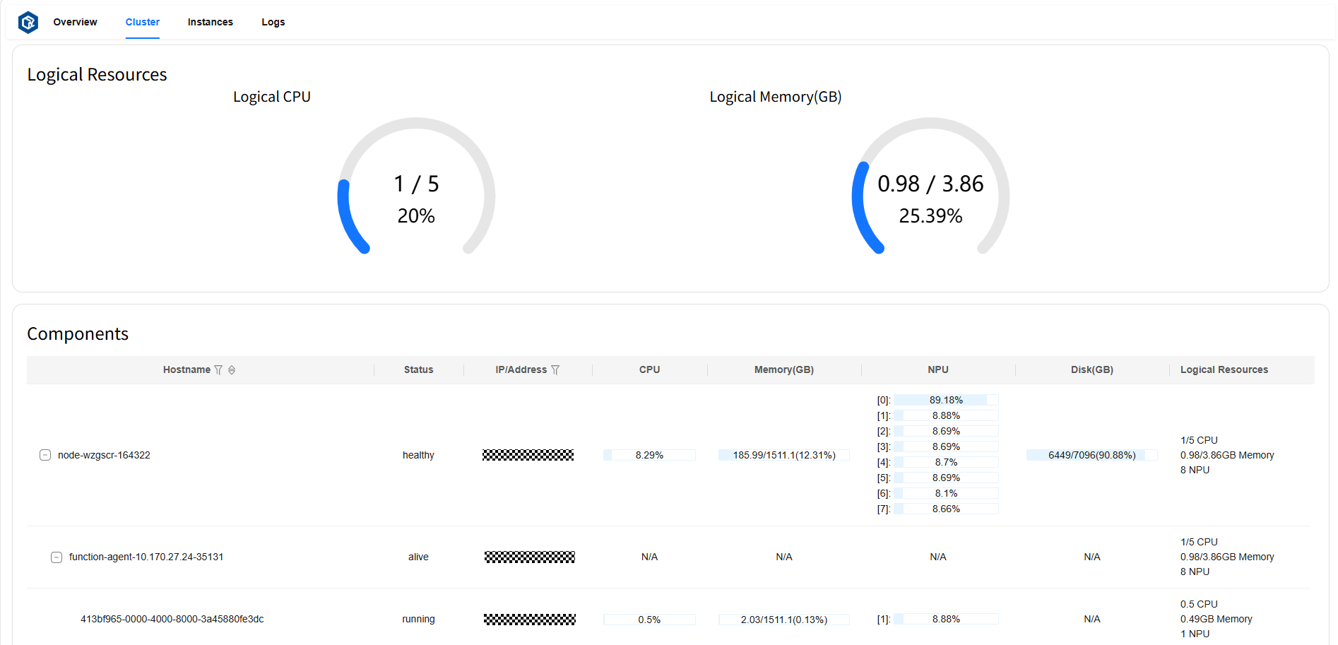 组件卡片(Components)展示了节点(node)的状态、地址、CPU 和 NPU 占用率、Memory/Disk/Logical Resources 各指标的使用量、总量及占用率;运行在对应节点上的代理(agent)的状态、地址、Logical Resources 指标的使用量、总量及占用率;运行在对应代理上的实例(instance)的状态、地址、CPU 和 NPU 占用率、Memory/Logical Resources 各指标的使用量、总量及占用率。