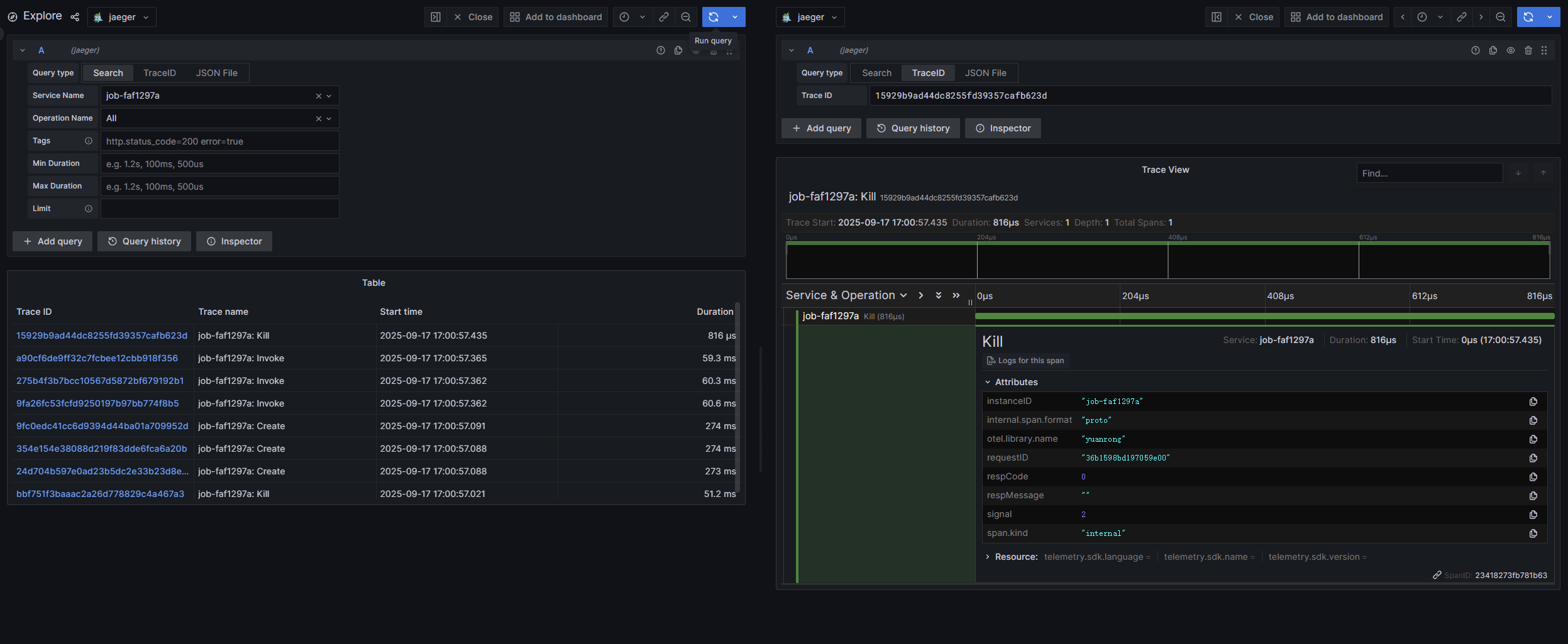 以配置 OtlpGrpcExporter 导出器对接 grafana 为例,无需额外增加代码,openYuanrong 将导出关键流程调用链,执行如下无状态函数。