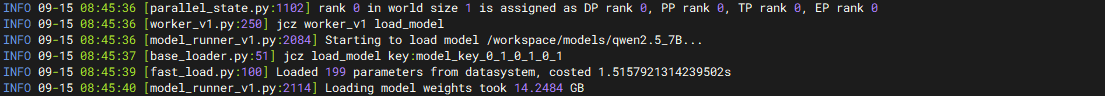 在 /tmp/yr_sessions/latest/log/ 目录下查看新扩容推理实例的运行日志文件 runtime-{runtime_id}.out,预期有如下输出,模型加载用时约 1.5 秒,10 倍的加速性能提升。